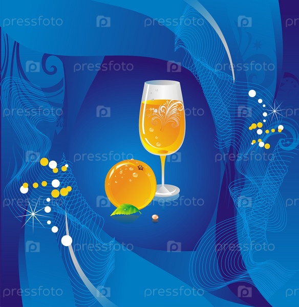 Бокал с апельсиновым соком и апельсин на синем фоне
