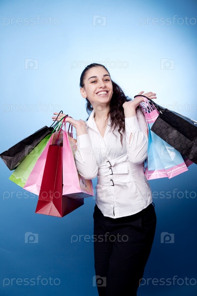 Привлекательная женщина с пакетами на голубом фоне