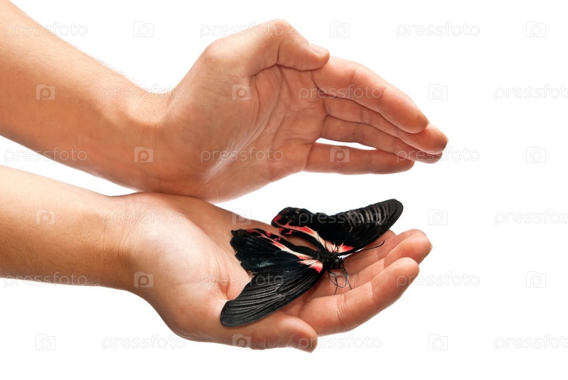 Руки, прикрывающие большую черную бабочку, изолированные на белом фоне