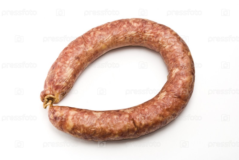 Кралька копченой колбасы на белом фоне