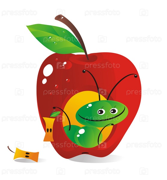 Гусеница, живущая в яблоке, на белом фоне, вектор