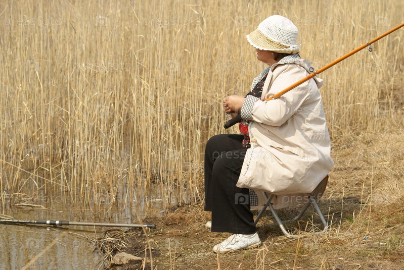 Женщина ловит рыбу на берегу озера в тростниках