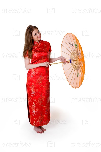 Женщина в красном платье с зонтиком