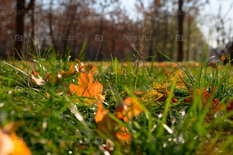 Осенние листья на зеленой траве