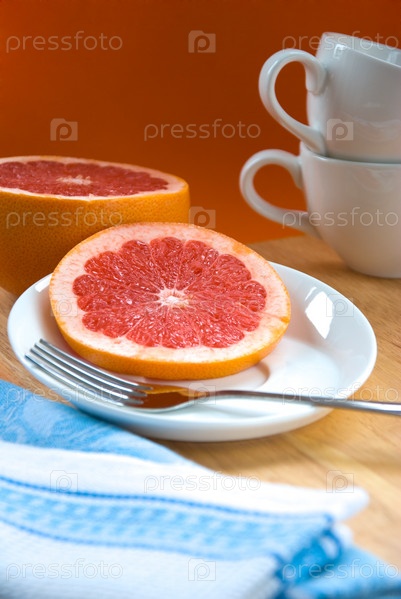 Грейпфрут на блюдце и две белые чашки