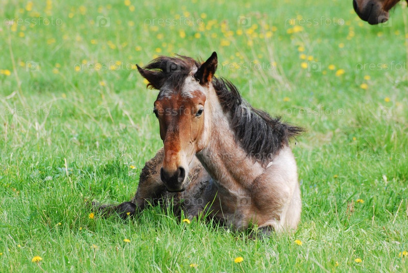 Жеребенок лежит на зеленой траве