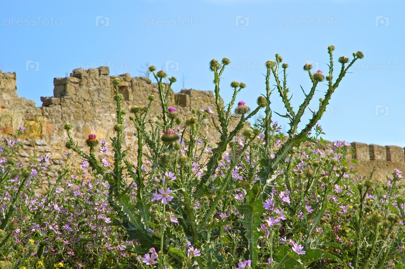 Средневековый замок недалеко от Одессы, Украина, Белгород Днестровский.Цветы Агримониса находятся перед стеной