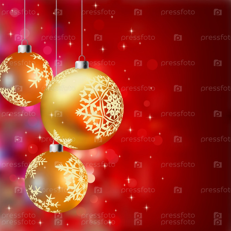 Елочные шары золотого цвета на красном фоне