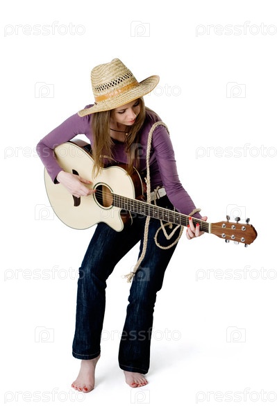 Молодая девушка играет на гитаре. Изолирована на белом фоне