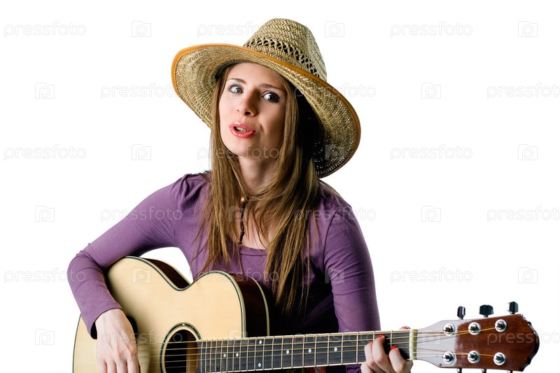 Молодая девушка играет на гитаре, изолированная на белом фоне