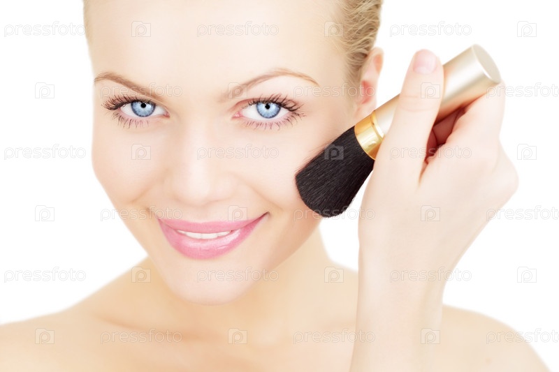 Молодая женщина наносит на лицо румяна кисточкой