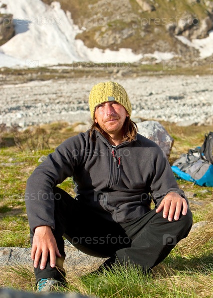 Мужчина в шапке, сидящий на траве в горах