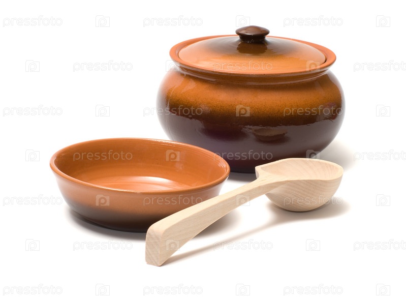 Коричневая керамическая посуда и деревянная ложка на белом фоне