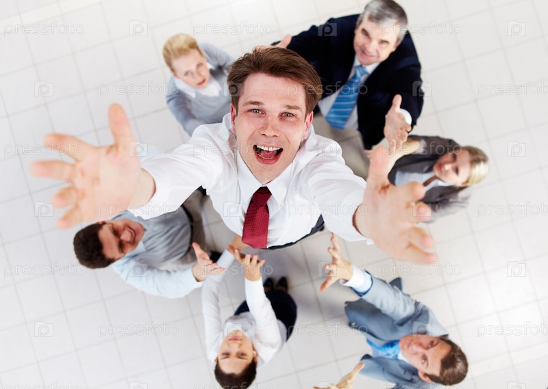 Восторженный мужчина, подкинутый вверх своими коллегами
