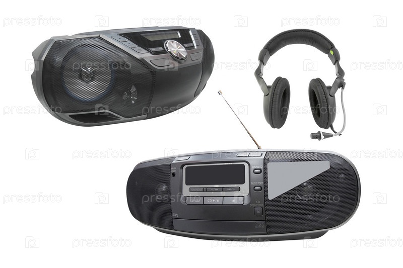 Магнитофон и наушники на белом фоне