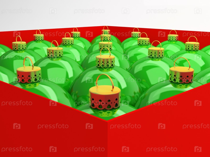 Зеленые новогодние шары в красной коробке на белом фоне