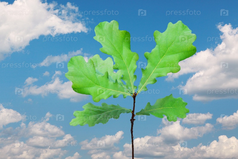 Веточка дуба на фоне неба с облаками