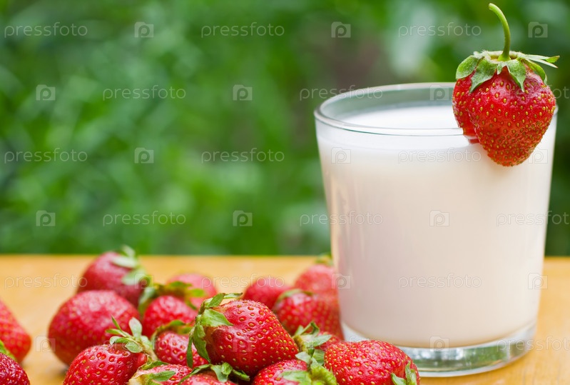 Клубника и стакан молока крупным планом