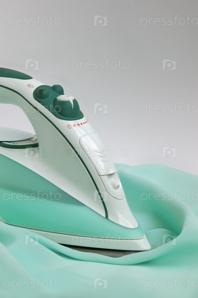 Утюг гладит голубую ткань