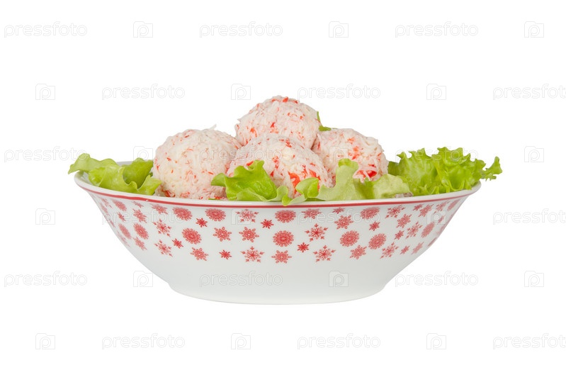 Крабовые шарики с листьями салата