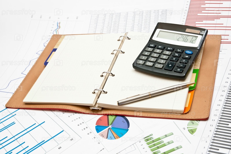 Записная книжка, калькулятор и бизнес-документация на столе