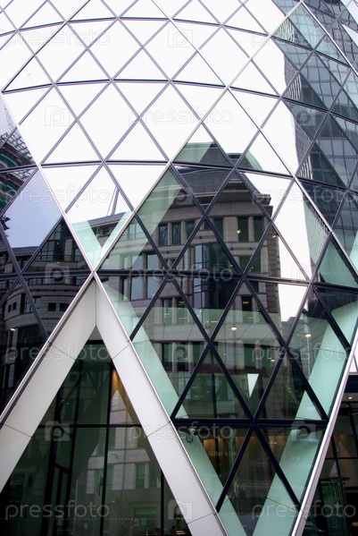 Старое здание отражаетя в зеркальном остеклении небоскреба в Лондоне