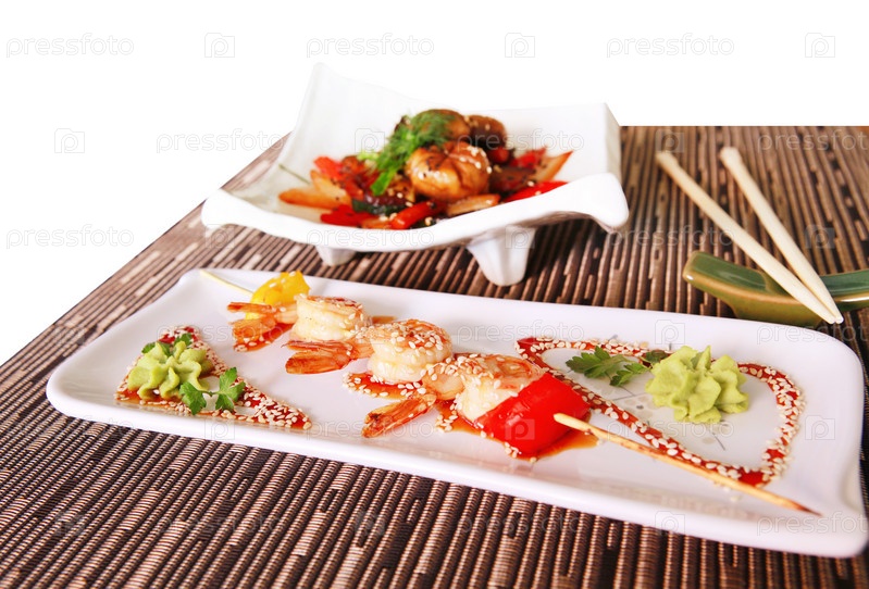 Японское блюдо креветки на шпажке на белом фоне