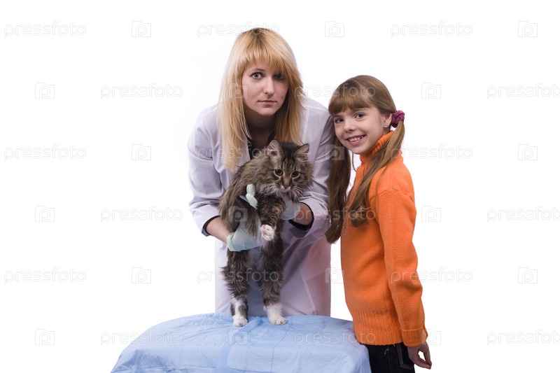Молодая девушка приносит кота на осмотр к ветеринару Красивый ветеринар и предмет кот. Ветеринар проводит медицинское обследование у кошки Белый фон