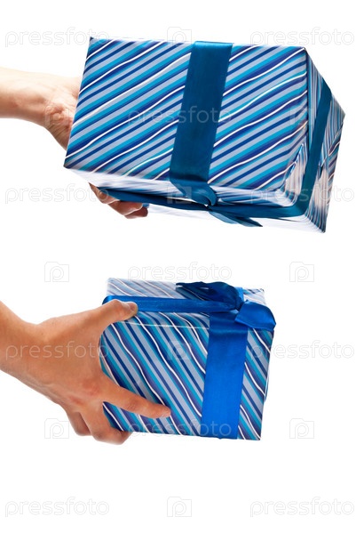 Два синих подарка в руках человека