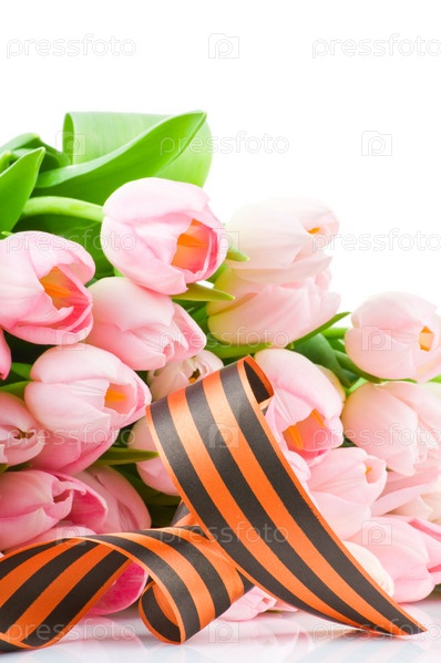 Букет розовых тюльпанов и георгиевская ленточка