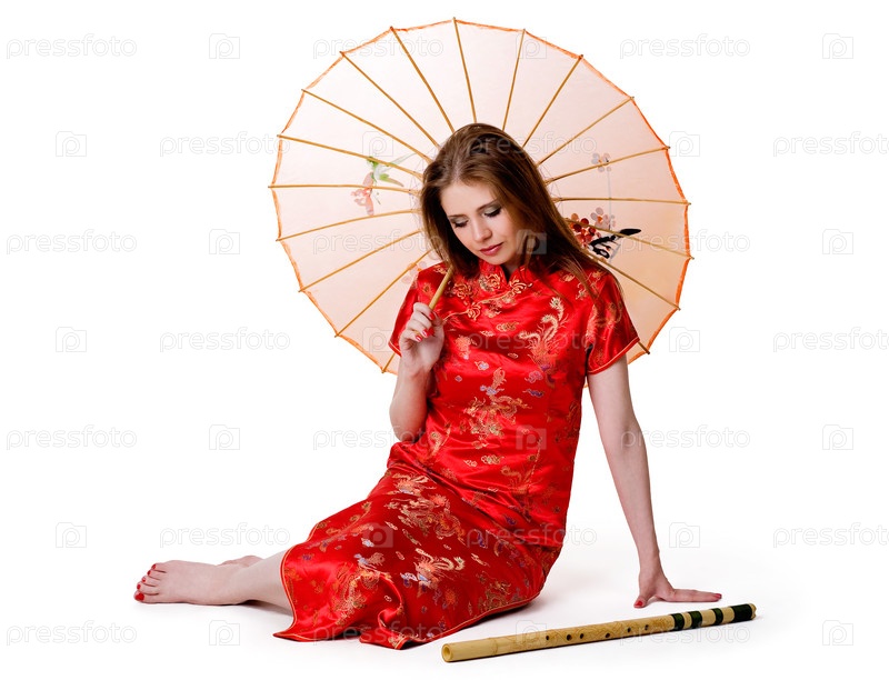 Сидящая женщина в красном этническом платье, с восточным зонтиком и флейтой, изолированная на белом фоне