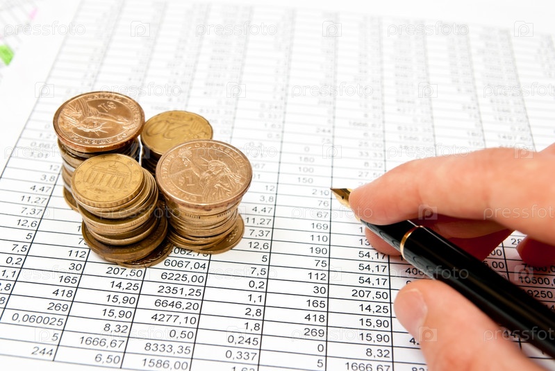 Пирамидки монет и рука с черным пишущим пером, лежащие на счете