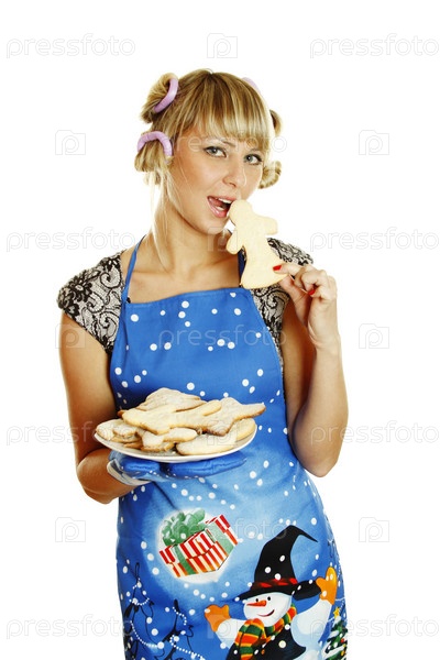 Блондинка в фартуке, поедающая печенье, изолированная на белом фоне