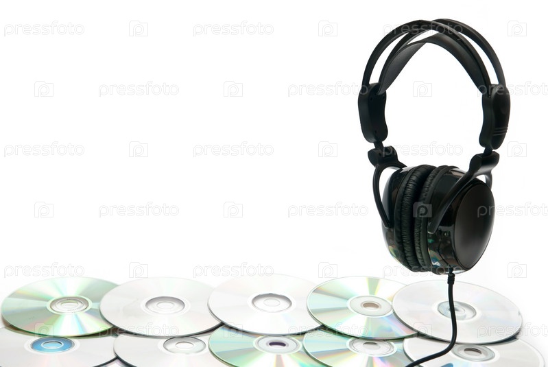 Черные наушники и диски на белом фоне