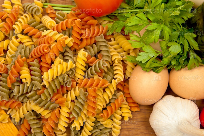 Цветные макароны, яйца, зелень и овощи крупным планом