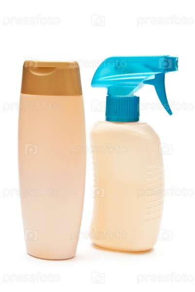 Бутылки от моющих средств на белом фоне