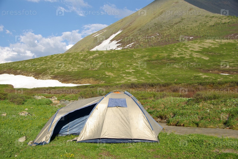 Туристическая палатка среди зеленых холмов