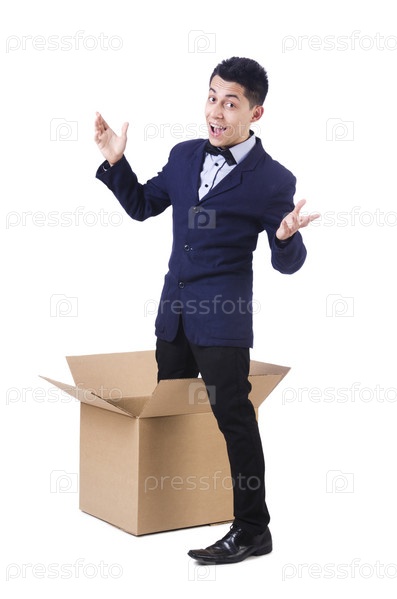 Бизнесмен с коробкой, изолированный на белом