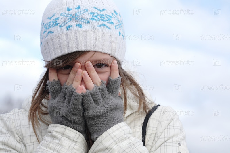 Портрет молодой девушки, смотрящей между пальцами