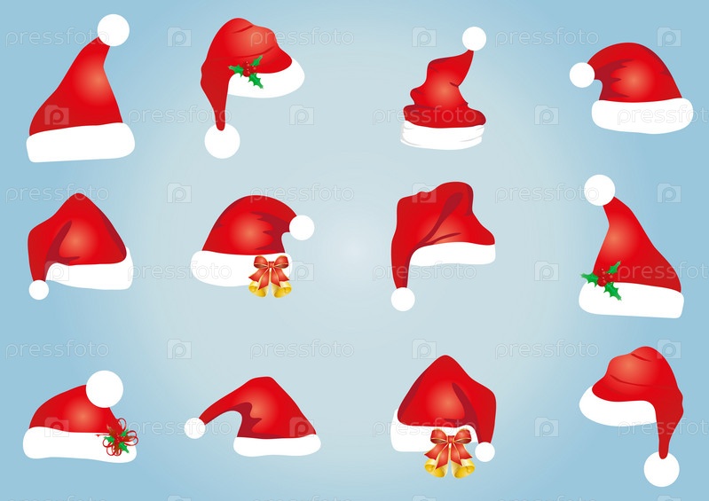 Коллекция колпаков Санта Клауса на голубом фоне
