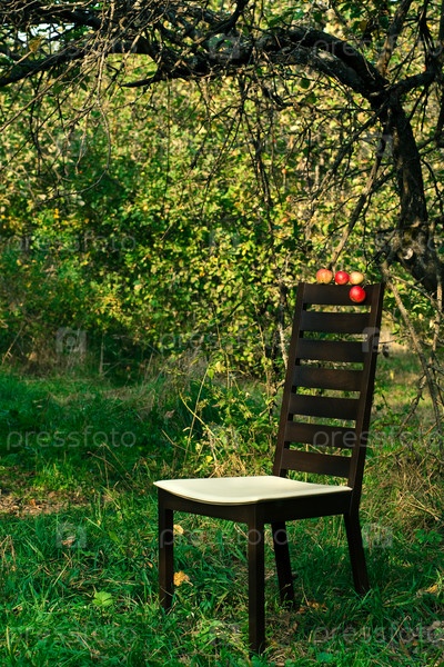 Современный стул в саду с красными яблоками на спине