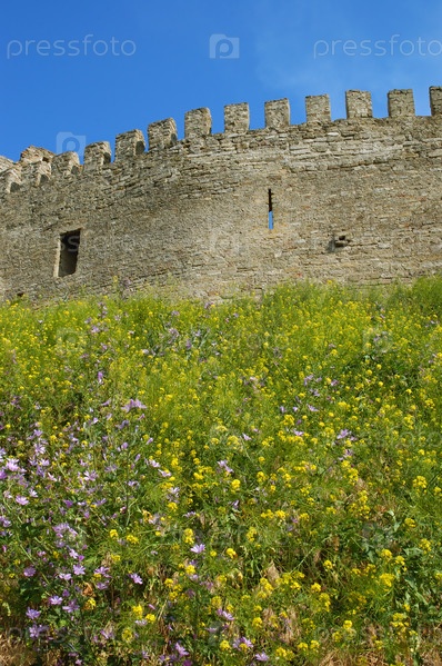Средневековый замок недалеко от Одессы, Украина, Белгород Днестровский.Цветочная луга перед стеной