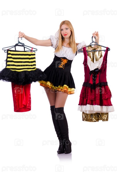Женщина меряет новую одежду на белом фоне