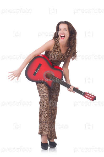 Женщина в леопардовом костюме с гитарой на белом фоне