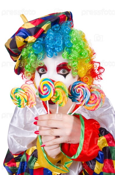 Клоун с леденцом, изолированный на белом фоне