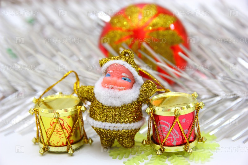 Санта с барабанами на фоне мишуры и шара