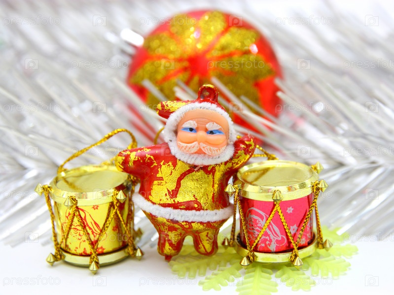 Санта Клаус с барабанами на фоне мишуры и шара