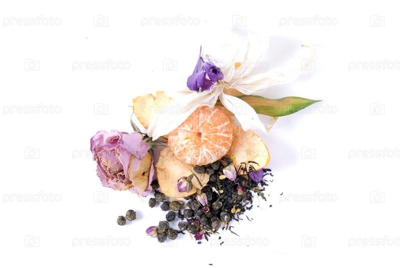 Композиция из засушенных цветов и цитрусов на белом фоне