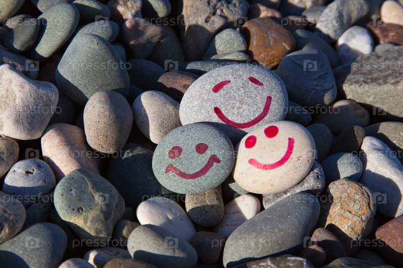 Галька с нарисованными глазами и улыбками на фоне других камней