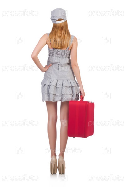 Молодая женщина с чемоданом на белом фоне